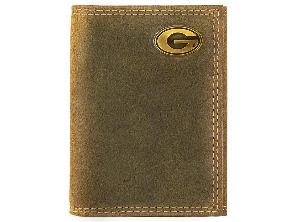 Show your football pride with an original Zep-Pro collegiate vintage tan leather trifold wallet. This accessory is popular among college students and alumni. It is a stylish and unique way to show enthusiasm while keeping important cards and cash organized. This Zep-Pro wallet is constructed of full grain leather with a vintage tan finish and features the school’s official logo, proudly displayed on the front upper right corner. The metal concho emblem has an antique brass finish which perfectly accents this unique wallet.