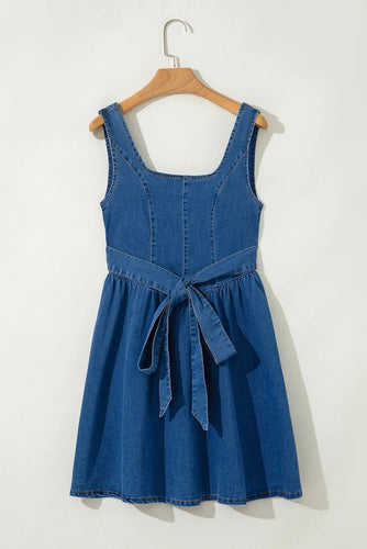 Sail Blue Square Neck Bowknot Sleeveless Denim Dress