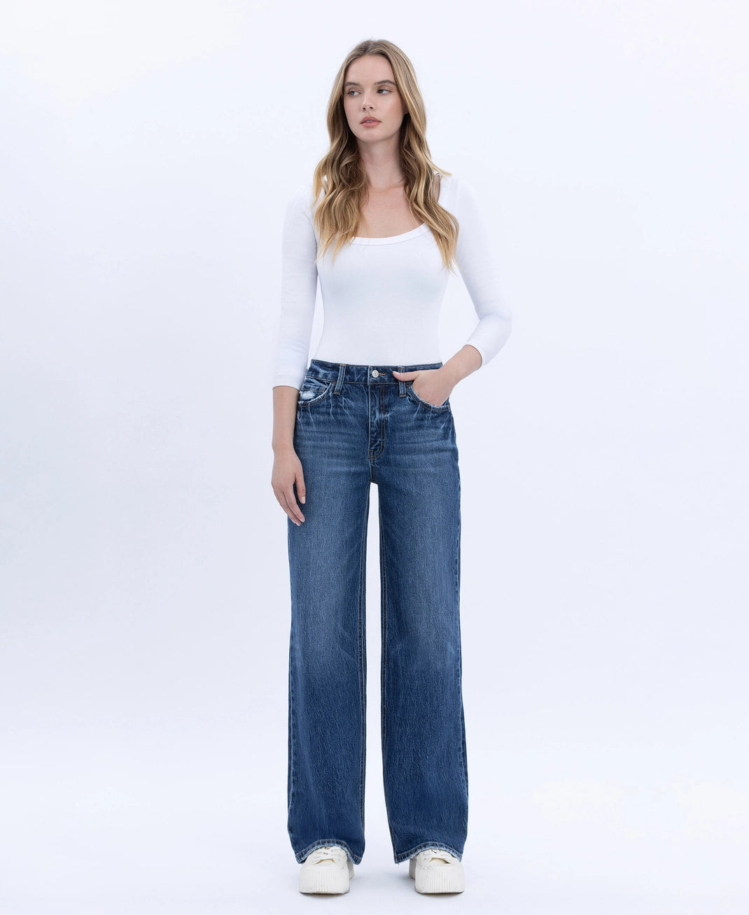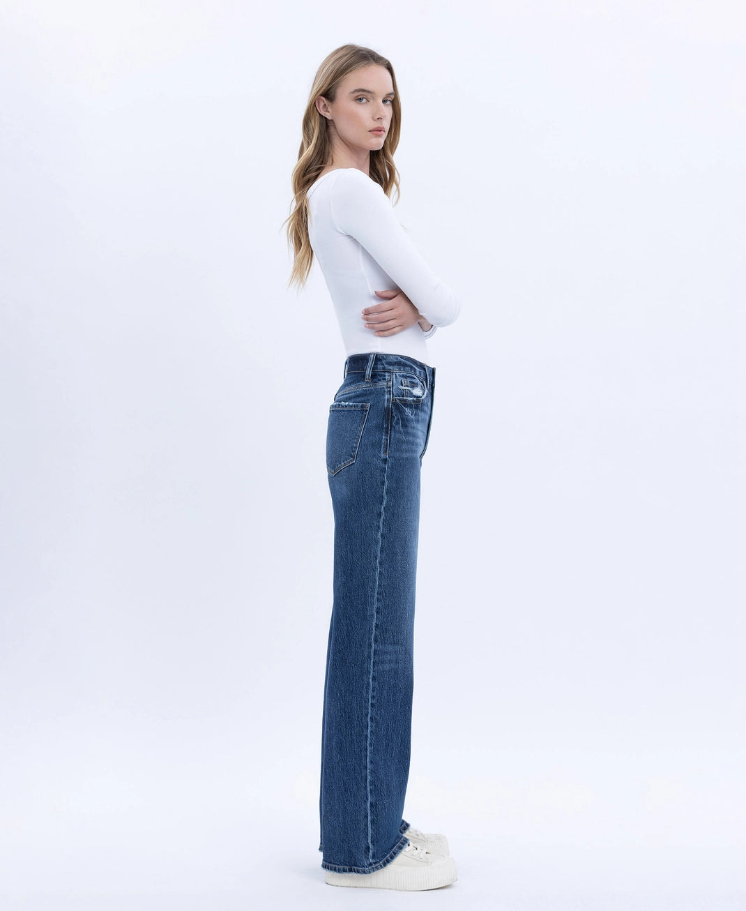90's super high rise dark wash wide jeans Comfort stretch denim, super high rise waist, lightly distressed detail, finished hem, full length, 90's wide jeans F. Rise: 11" / inseam: 32" / leg opening: 20"